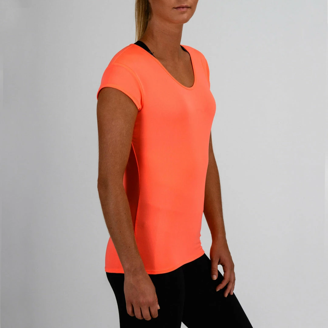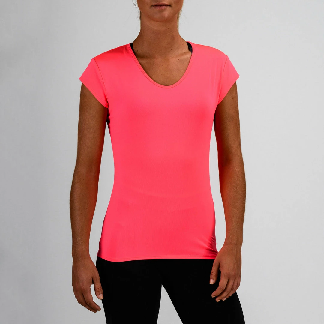 This short-sleeved T-shirt flatters your figure with a straight cut and V-neck for all your fitness activities. Choose this light T-shirt to stay dry as you work out!
