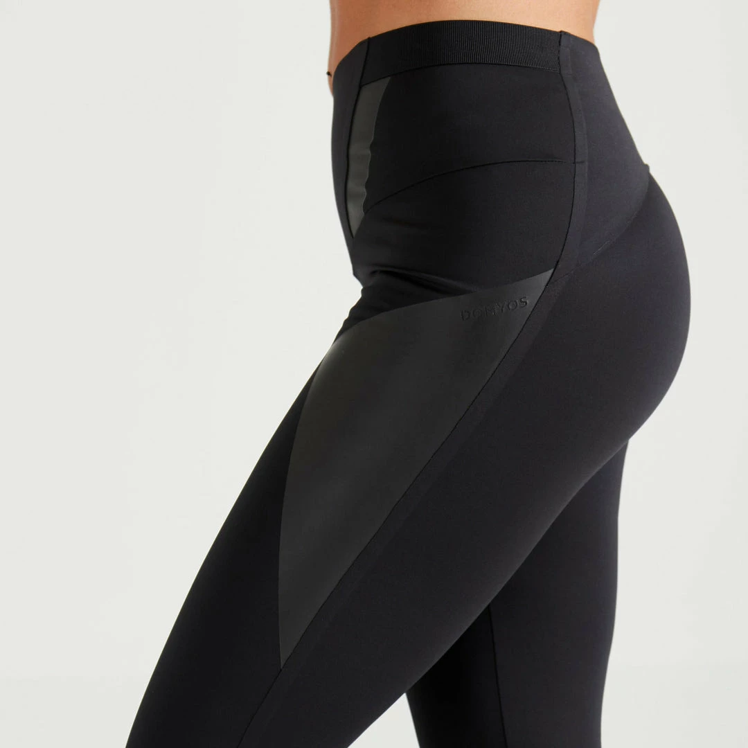 Ultra-technical, fully thermobonded leggings in a very shaping material. Its “superhero” inspired waistband and leather inserts provide a powerful style.
