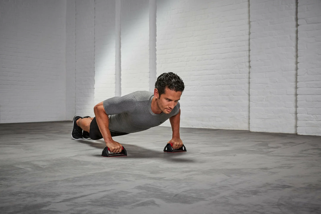 The use of Push-Up Bar Grips will raise your hands off the ground and increase your range of movement.