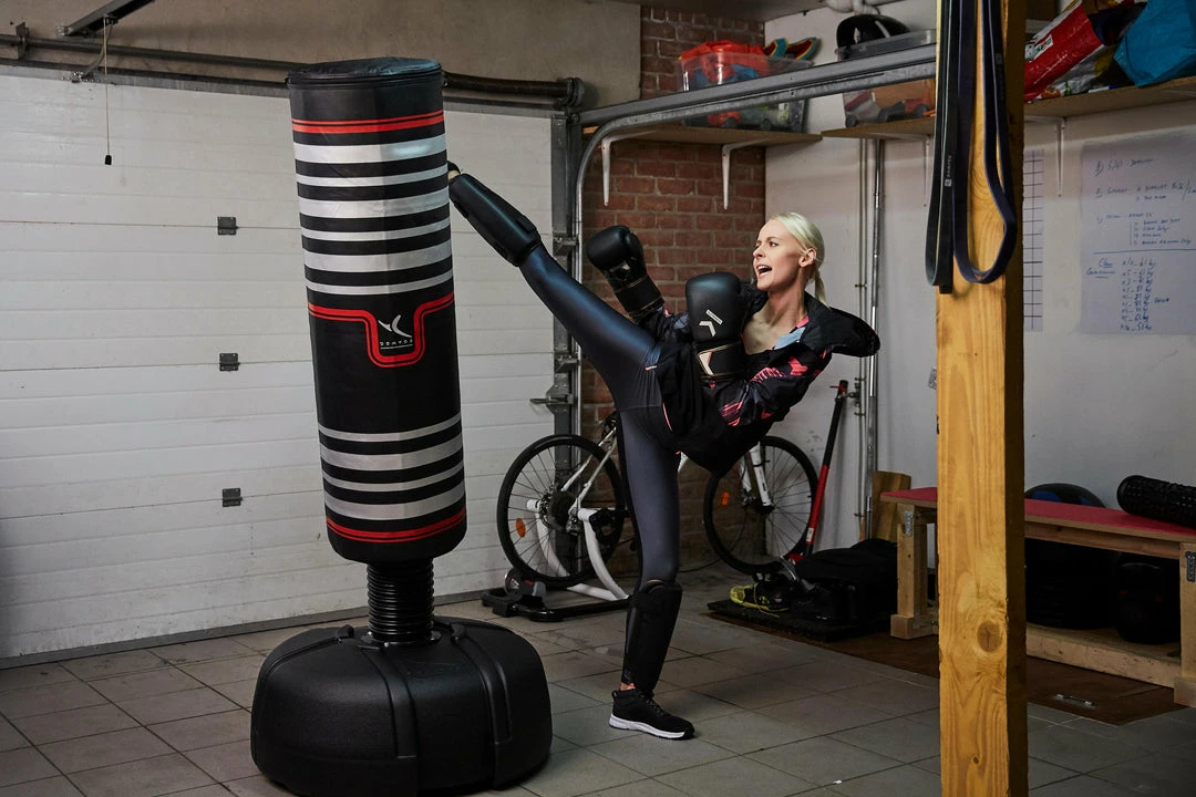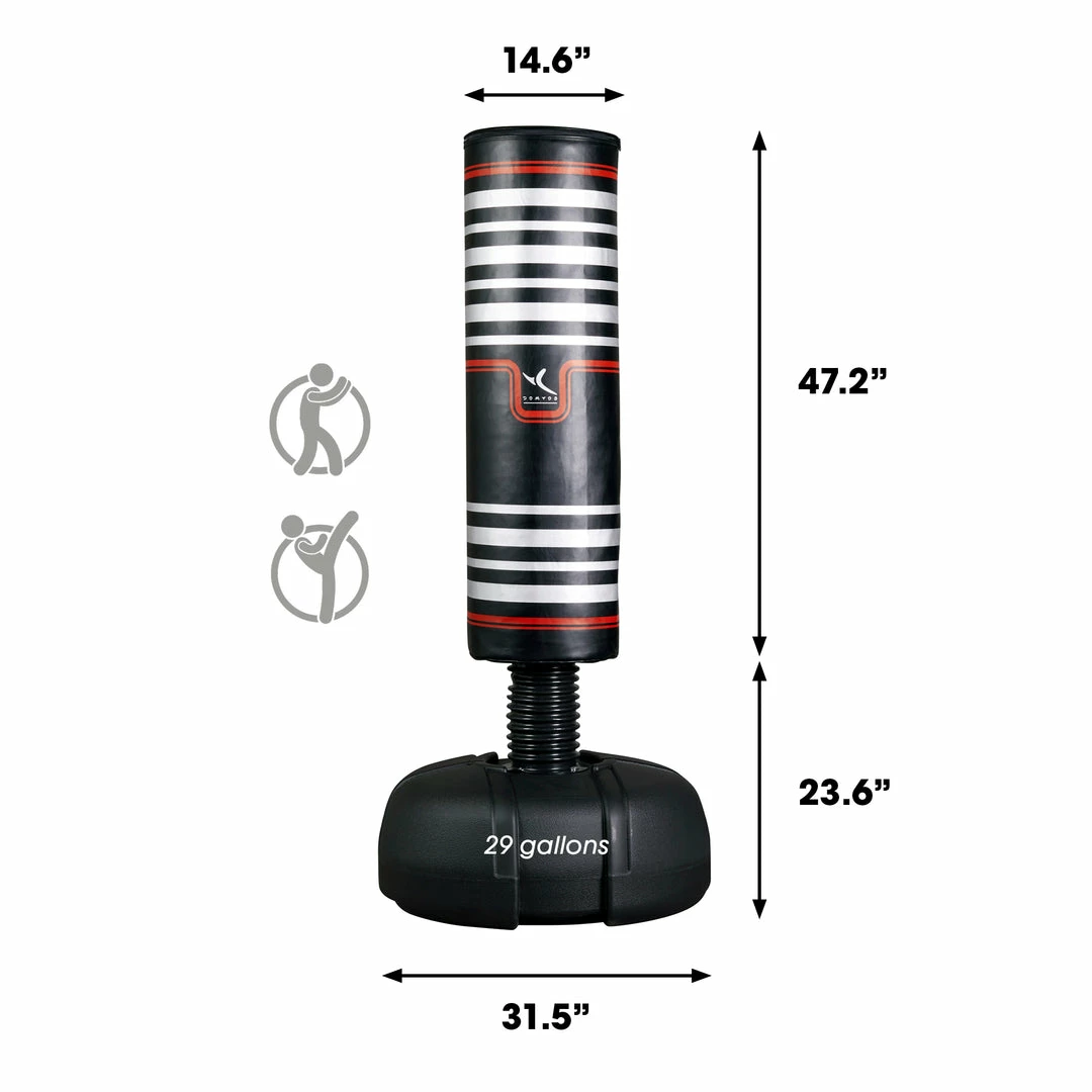 This free-standing punching bag is perfect for punch/kick training for advanced athletes: boxing, Muay Thai, kickboxing, full contact karate. Its base can be filled with water to keep it stable.