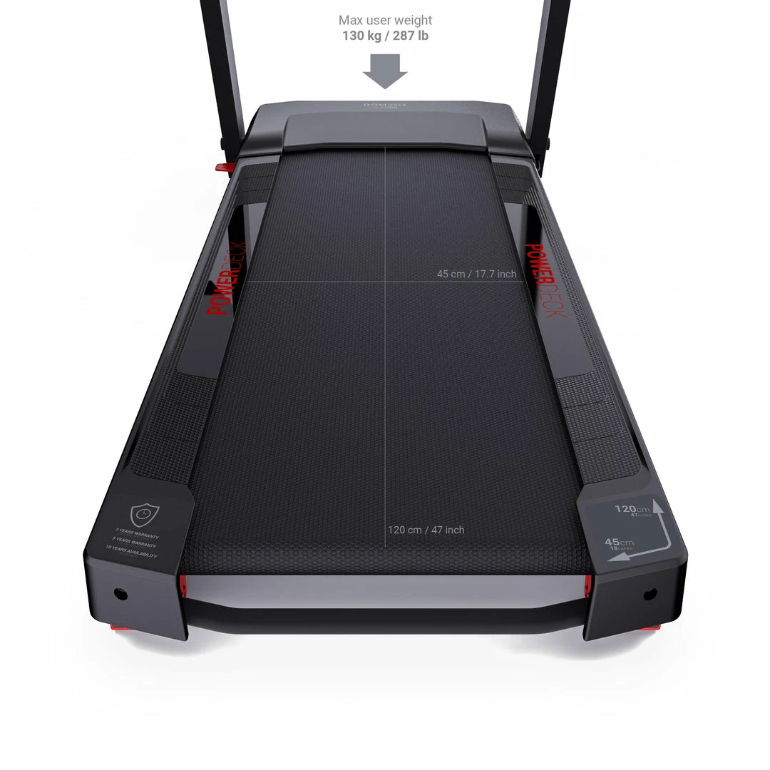 Domyos sizes all of the electrical components based on the treadmill’s maximum capacities, to ensure the best user experience and a reasonable electrical consumption. All of our treadmills are tested in the laboratory for 600 hours non-stop to ensure the integrity of their components.
