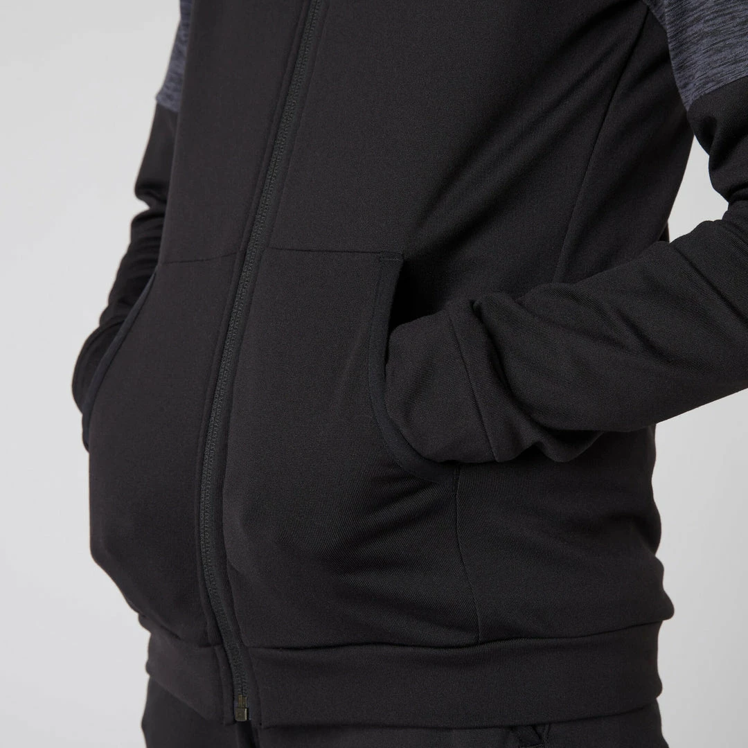 A warm and breathable zip-up hooded sweatshirt in synthetic fabric.