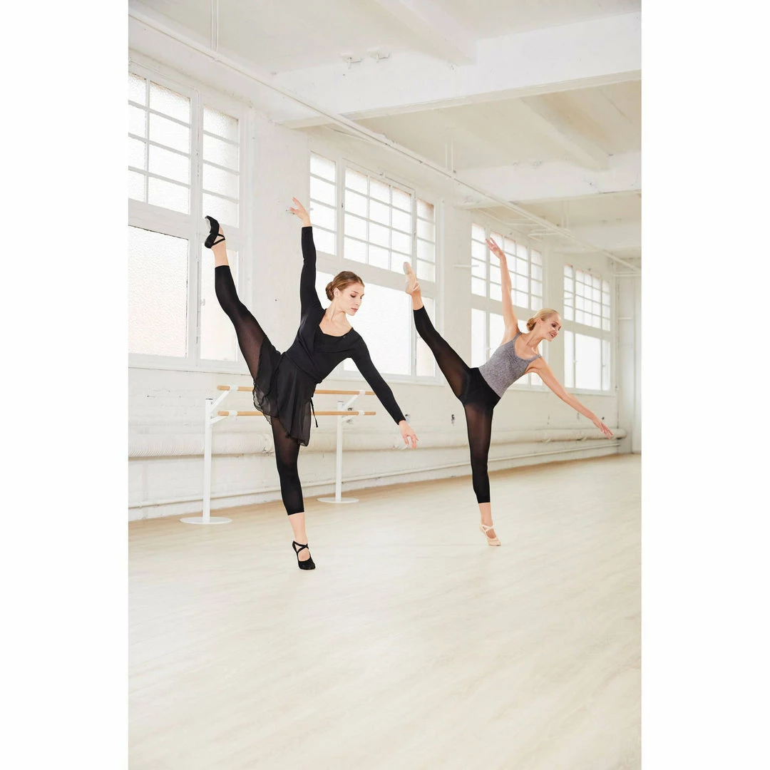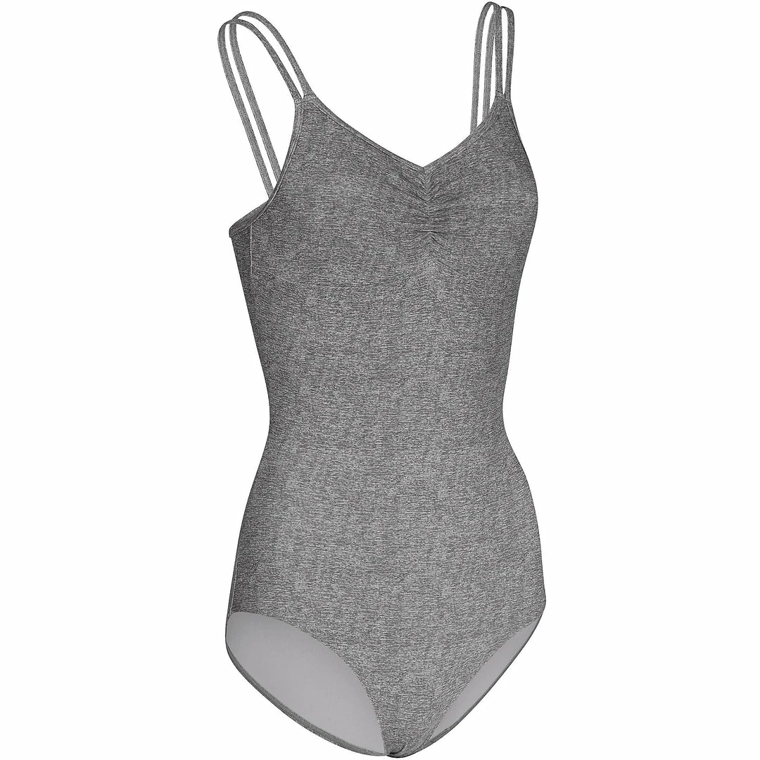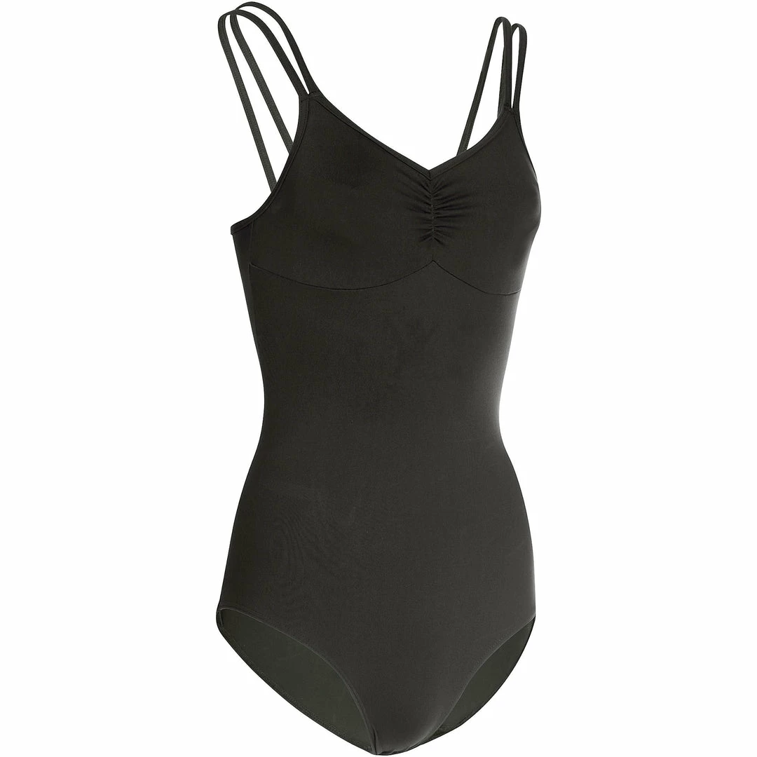 Ballet leotard with crossed, thin double straps. V-shaped neckline in front. Straight neckline to mid-back. Integrated bra for optimal breast support.